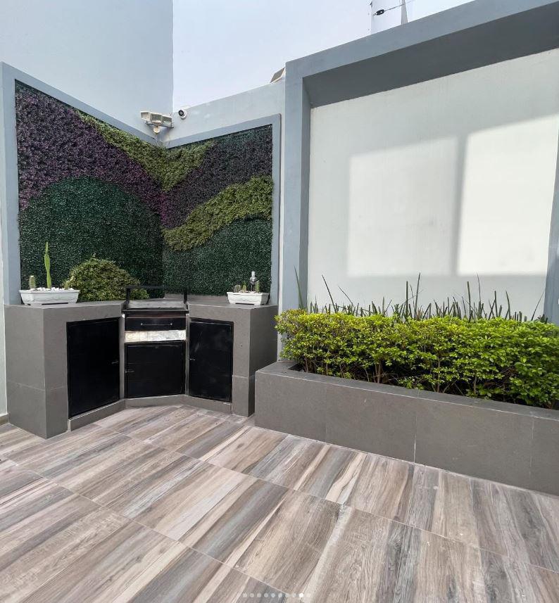 - La cocina se encuentra equipada con horno de microondas, horno convencional, tarja doble, parrilla y campana. También cuenta con cámaras de videovigilancia y lámparas de lujo .